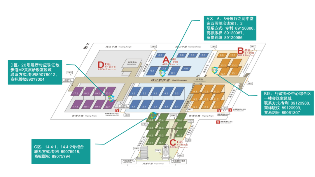 B区10.1展厅北门柜台和D区珠江散步道20-3、4柜台。